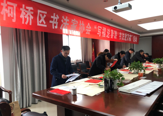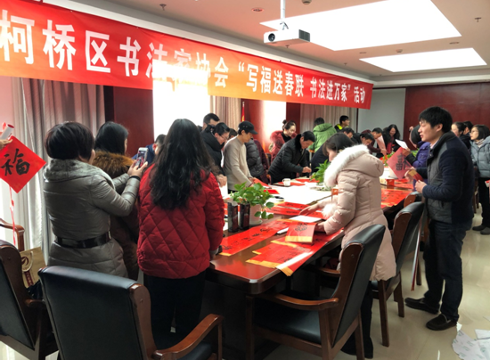 活動現場,六位書法家揮毫潑墨,并時不時地與書法愛好者面對面交流,從用筆方法、結構安排、章法布局等方面詳細講解書法的法度及各種書體的特點。不一會兒,一幅幅雄健蒼勁的對聯和“?!弊终宫F在大家面前,整個會議室頓顯紅紅火火,熱鬧喜慶。感謝區書法家協會的六位書法家為員工們送上一道別開生面的視覺盛宴。